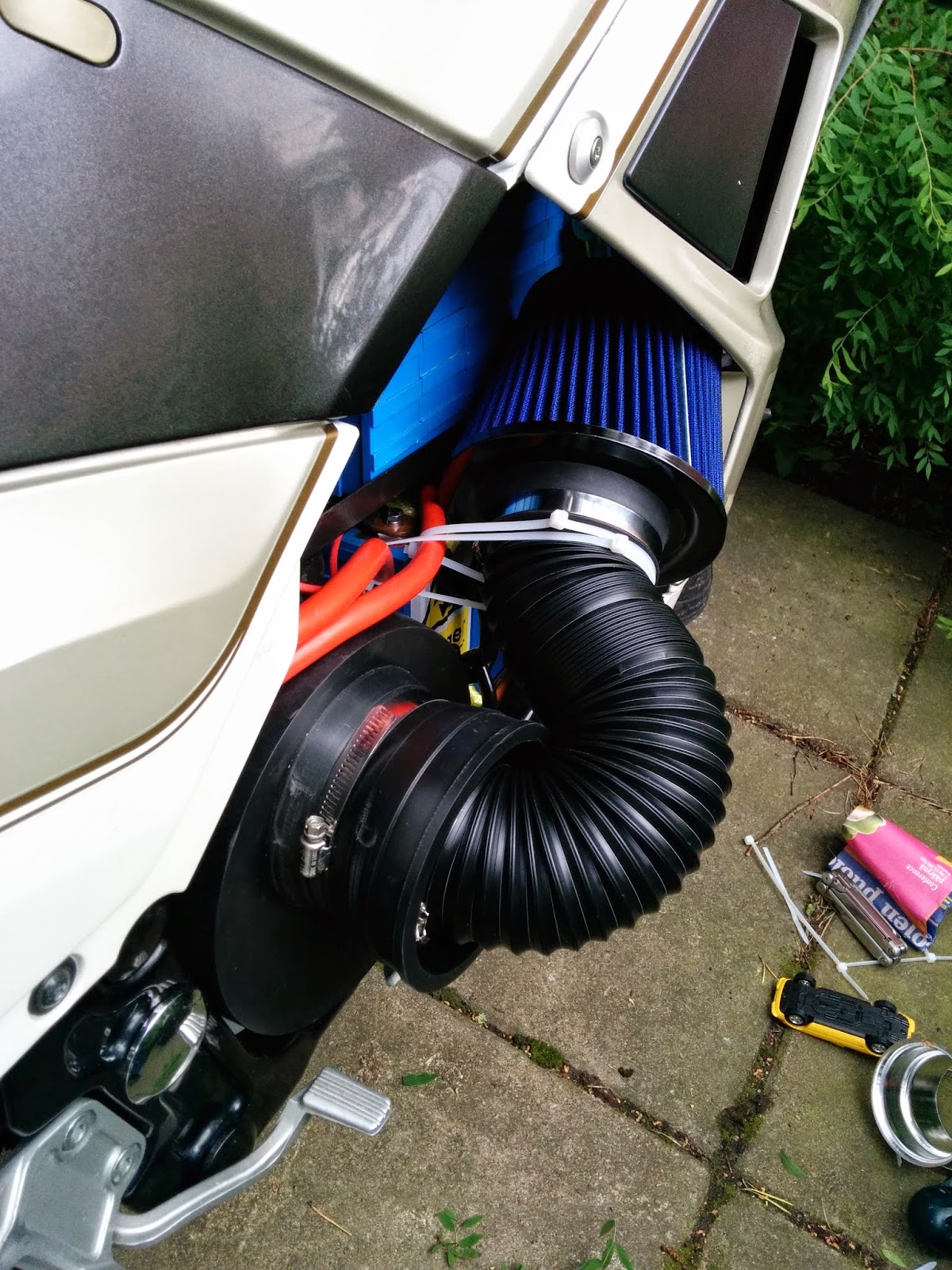 Update: If you're wondering what this has to do with waterproofing, my thinking is that adding the filter and moving it a little further away would mean less water in the motor. Water entering the filter at standstill should also not find it's way inside the motor nearly as much as it does now. This setup also gives me the option of moving the intake filter somewhere else using some flexible tube.